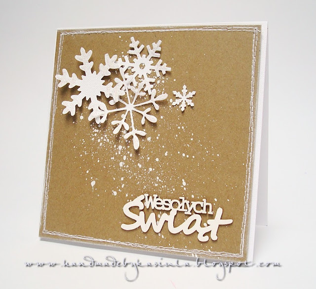 Te Święta zdecydowanie będą eco, brązowy papier kraftowy, kilka śnieżynek, brokat (którego jak zawsze nie widać na zdjęciach) napis tekturowy z Wycinanki, przeszycia i powstały cudowne Świąteczne kartki.